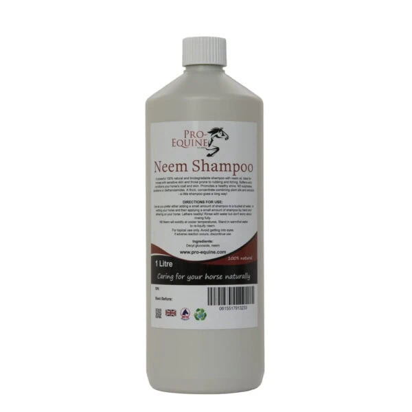 Neem horse shampoo is 100% plant-based to nourish and enrich your horse's skin and coat. This natural shampoo is ideal for sensitive skin. Enriched with multi-functional neem oil full of beneficial fatty acids, this concentrate shampoo nourishes dry, problem skin areas and helps restore elasticity to the skin while encouraging healthy hair re-growth. Neem shampoo develops a healthy shine and appearance with each wash. Great for summer skincare when horses are itchy and tend to rub more frequently.
